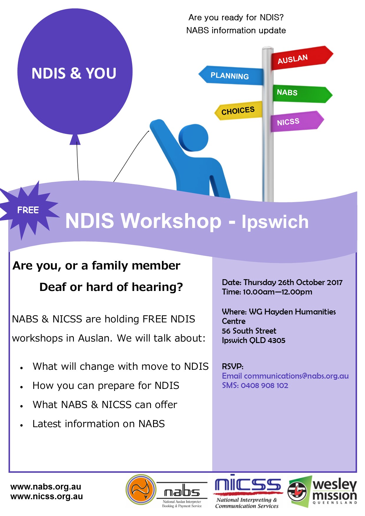 NABS and NICSS is holding a free NDIS information workshop in Ipswich on Thursday 26 October 2017 from 10am-12pm.